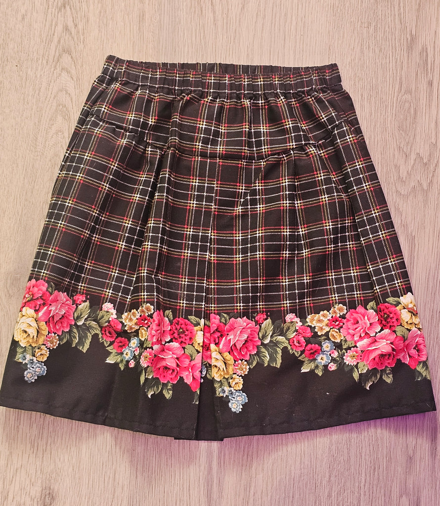 Vintage plaid and Roses skirt. Has a pleated in the back for mobility. Yes - you can run and twirl in it!